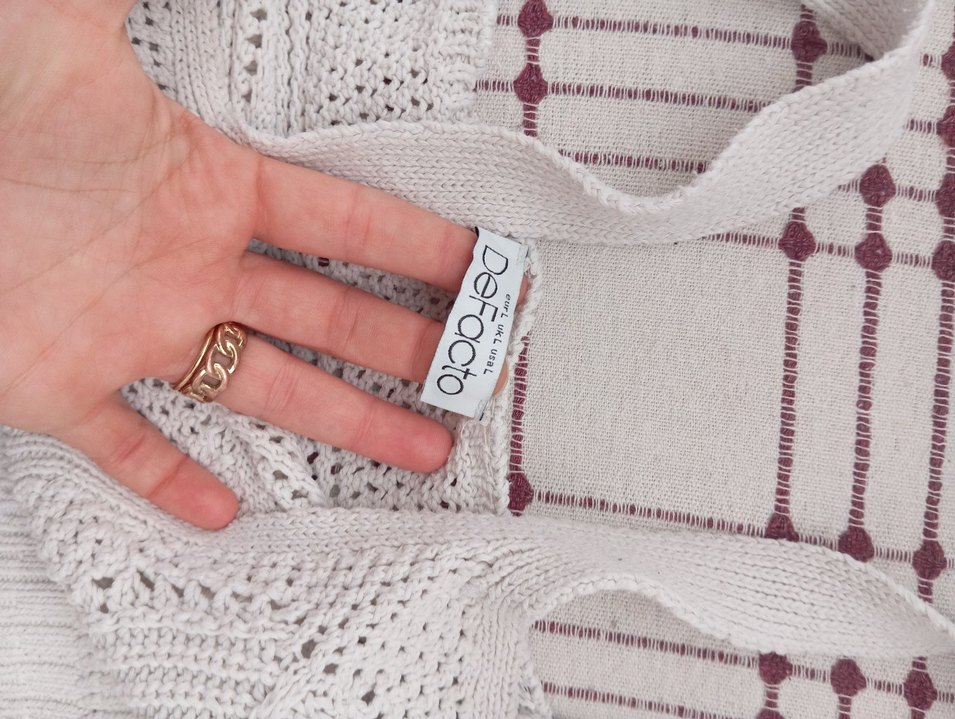 Nakış detaylı, örgü dokulu, bej renkli, bohem ve retro tarzda, bisiklet yaka ve askılı kollu, normal uzunlukta hamile hırkası.
