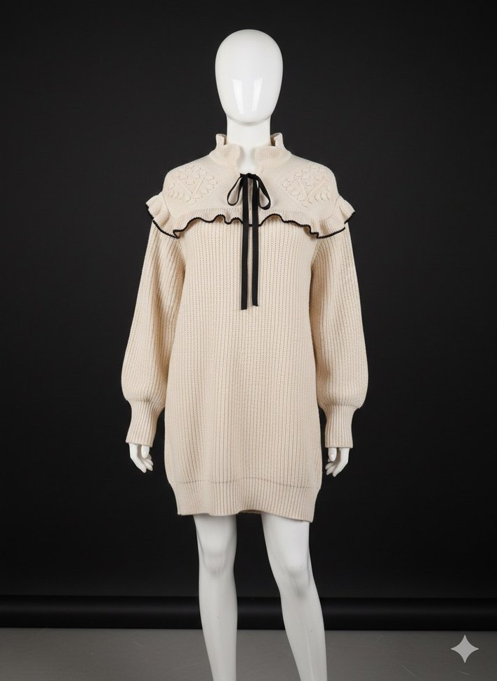 Yüksek yakalı, uzun kollu ve bol kesimli bej triko kazak. Nakışlı detaylar ve yakada siyah bağcık bulunur. Günlük kullanıma uygun, rahat ve şık bir parça.