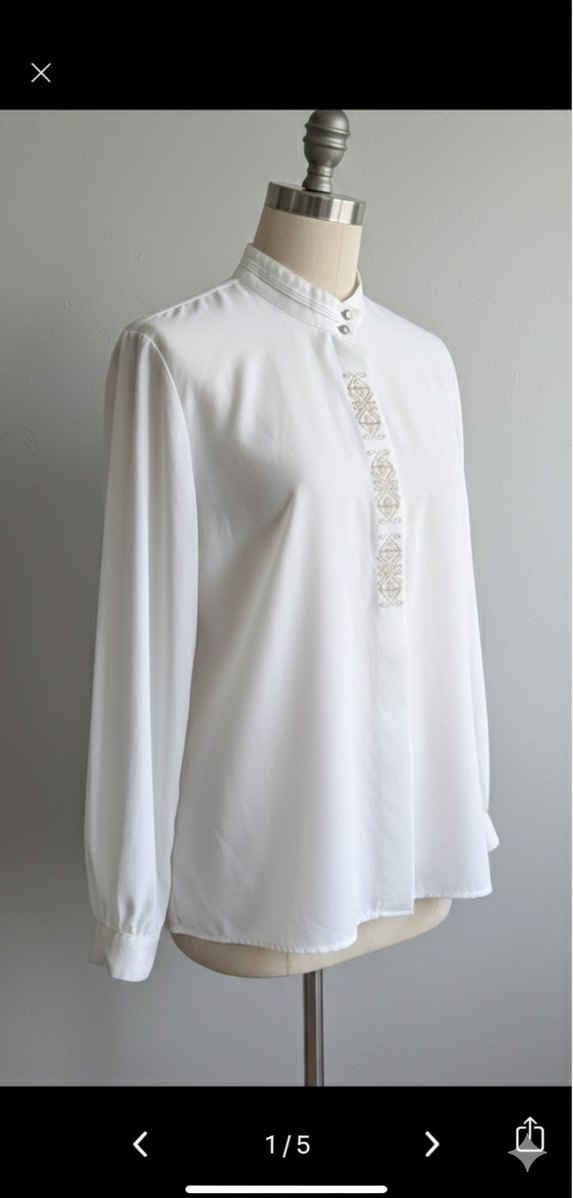 Yüksek yakalı ve düğmeli manşetli uzun kollu, beyaz kadın gömleği. Pamuk kumaştan, bol kesim ve normal midi boyda. Önünde vintage nakış detayları bulunur, ofis için uygundur.