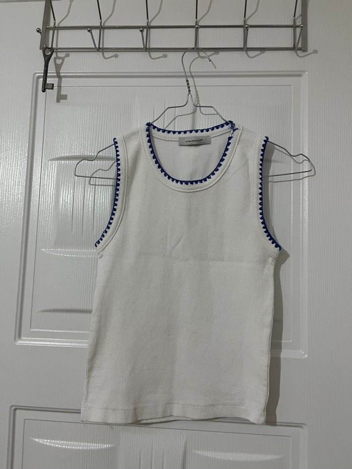 Mavi nakışlı kenarları ve dar kesimiyle beyaz kolsuz triko atlet, minimalist ve bohem tarzı bir araya getirir.