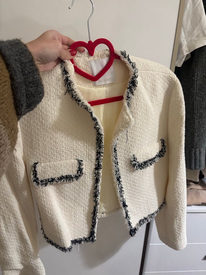 Nakışlı detaylara sahip beyaz triko midi ceket, uzun kollu ve kesimli yapısıyla günlük kullanıma uygun, trend sokak tarzında bir üründür.