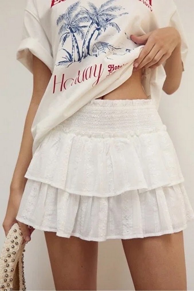 Pamuklu, nakışlı ve fırfırlı detaylara sahip bol kesim beyaz mini etek. Bohem ve rahat sokak stiline uygun.