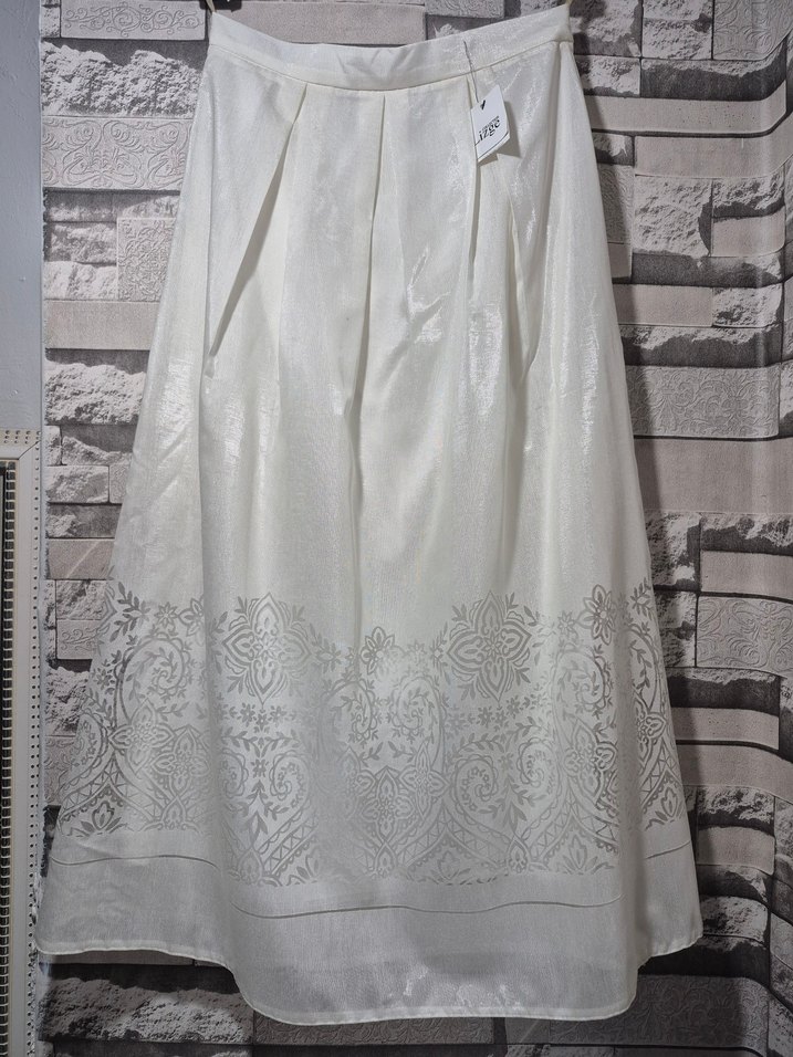 Bu beyaz uzun etek, dökümlü tasarım ve gri nakış desenlere sahip, yumuşak sentetik kumaştan üretilmiştir. Bol kesim ve klasik vintage stilde olup düğünler için uygundur.