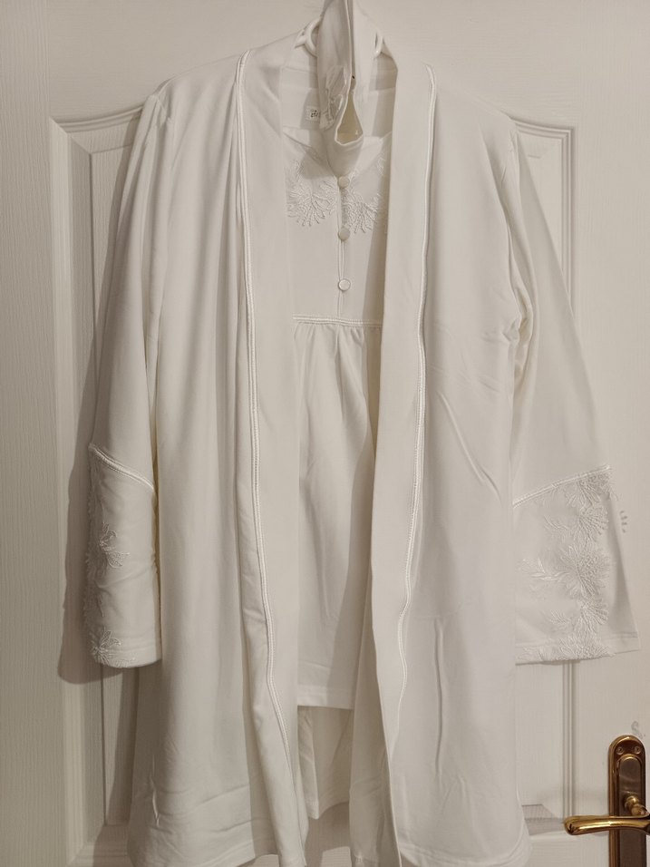 Beyaz kadın sabahlık, uzun kollu ve nakış işlemeli çiçek detaylarına sahip.Hiç giyilmedi. Yıkanıp ütülendi. beli lastiklidir.