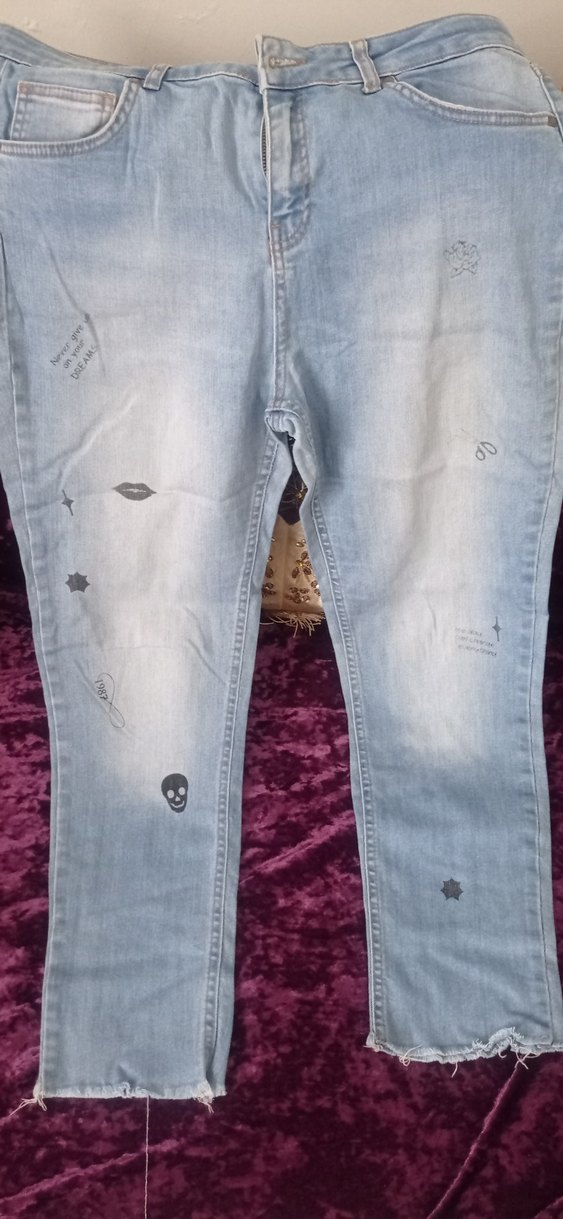 Nakış Detaylı Düğmeli Gri Mavi Kadın Kot Pantolon
