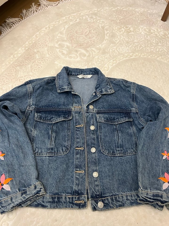 Nakış Detaylı Düğmeli Mavi Denim Ceket