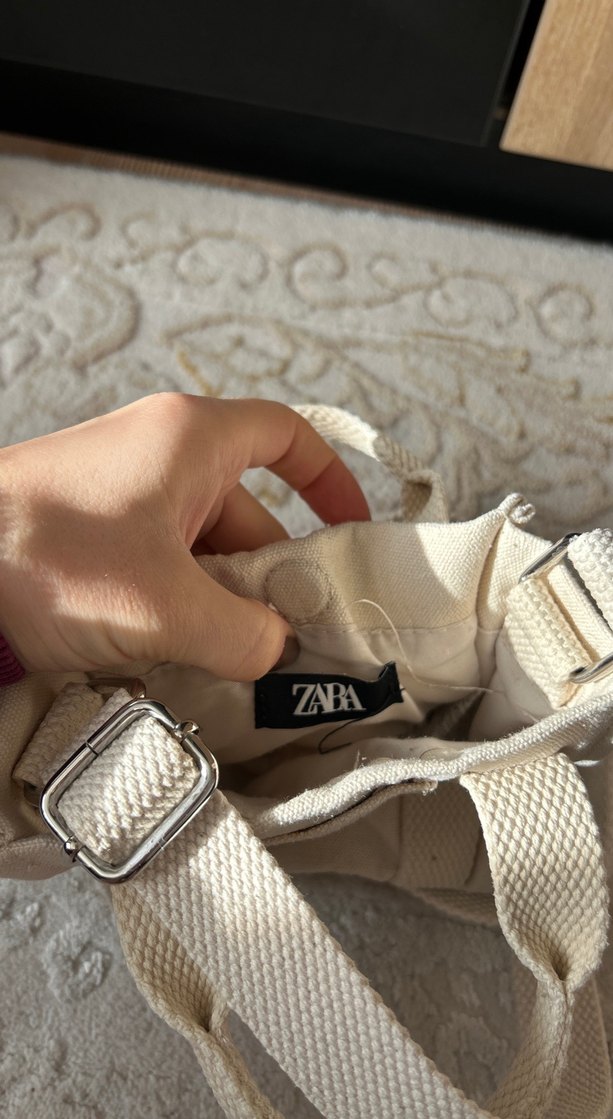 Nakışlı desenlere sahip beyaz bebek çantası, ayarlanabilir askılarla yumuşak ve dayanıklı kumaştan üretilmiştir. Marka etiketi 'ZARA yazmaktadır.