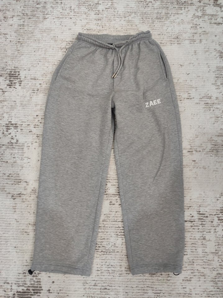 Nakış detaylı, bol kesim gri eşofman altı, ayarlanabilir bel ve yumuşak, sıcak kumaştan günlük rahat kullanım için.