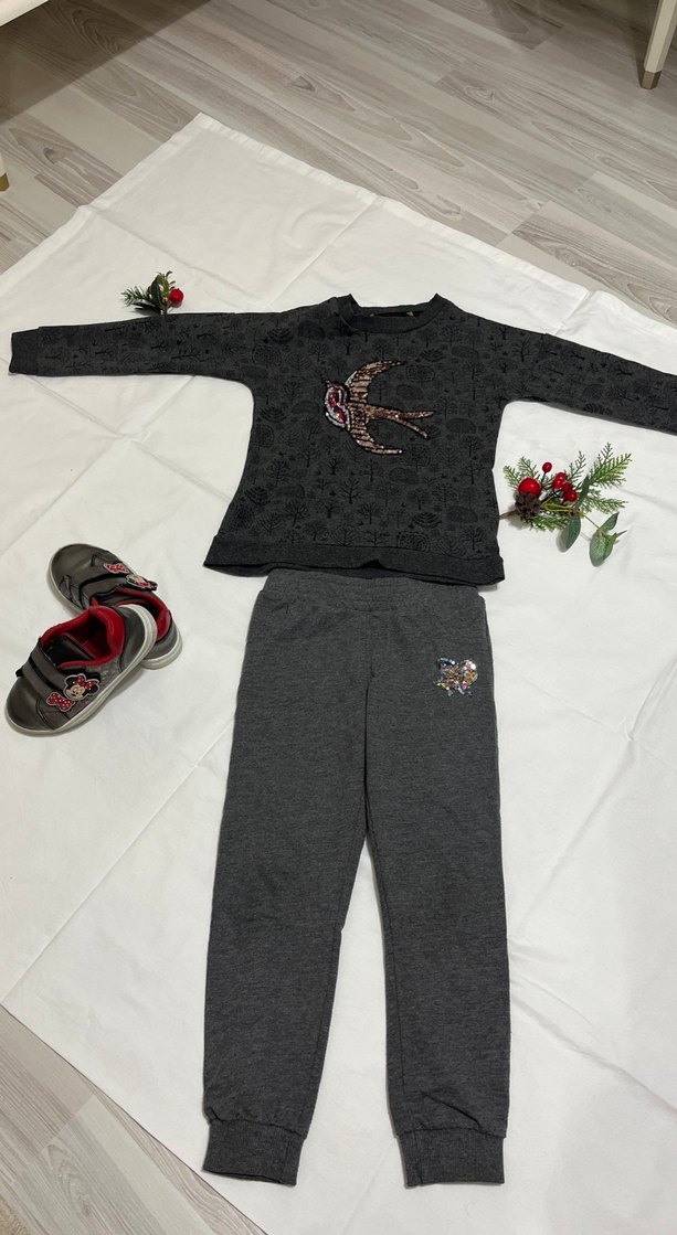 Gri renkli, nakış detaylı örme kumaştan yapılmış bol kesim kız eşofman takımı. Uzun kollu ve bisiklet yaka, trend sokak stili için uygun. Minnie disney marka 28 numara ayakkabı az kullanılmış