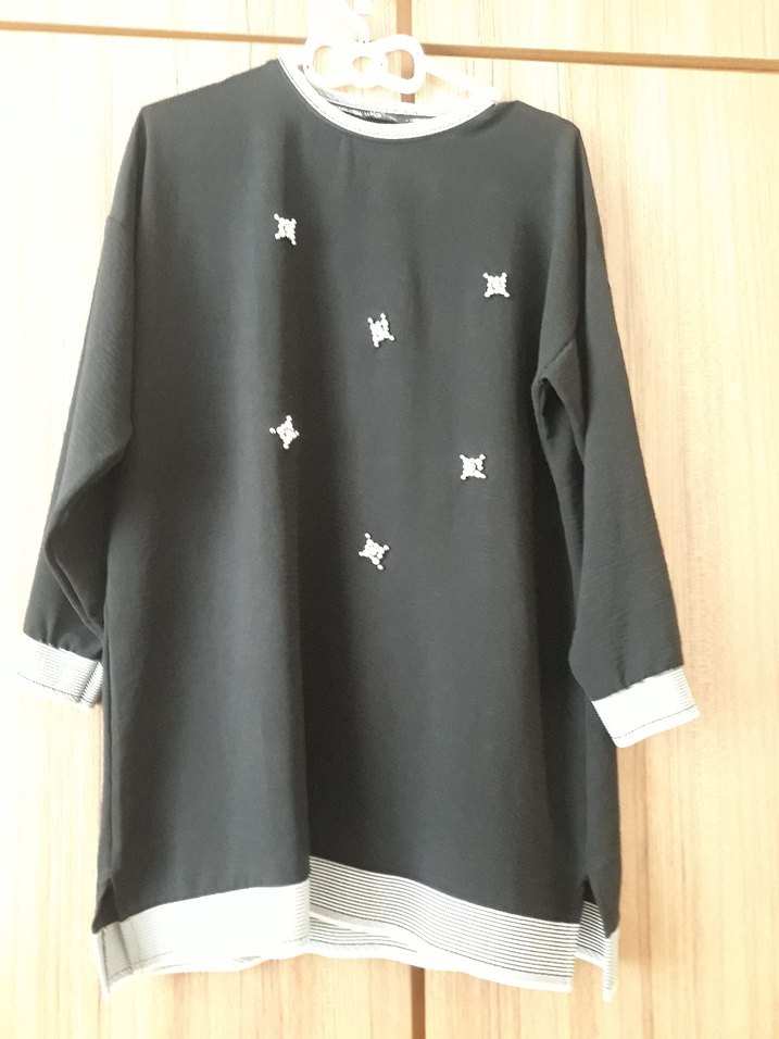 Uzun kollu, yuvarlak yakalı, nakış detaylı bol kesim gri tunik .2 beden tahminen 40 bedene olur, yumuşak sentetik kumaştan üretilmiştir.