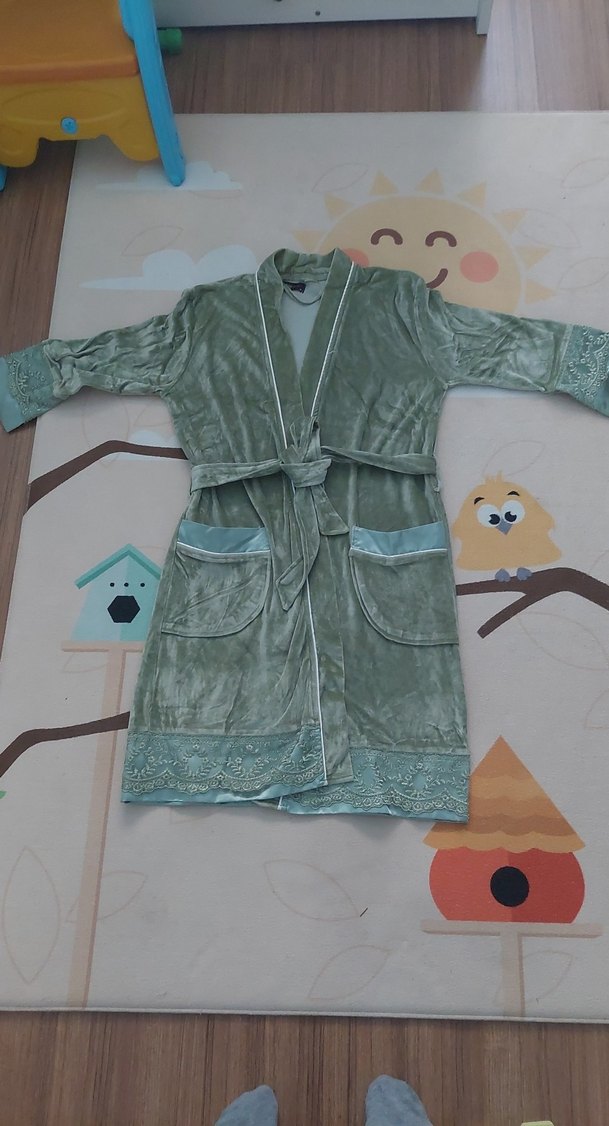 Gri uzun kadın bornoz, bol kesim ve uzun kolludur. Yumuşak kumaştan yapılmış, manşet ve etek kısmında nakış detayları bulunur. İki ön cep ve bağlama kemeri vardır. Rahat ve bohem tarz için uygundur. ️