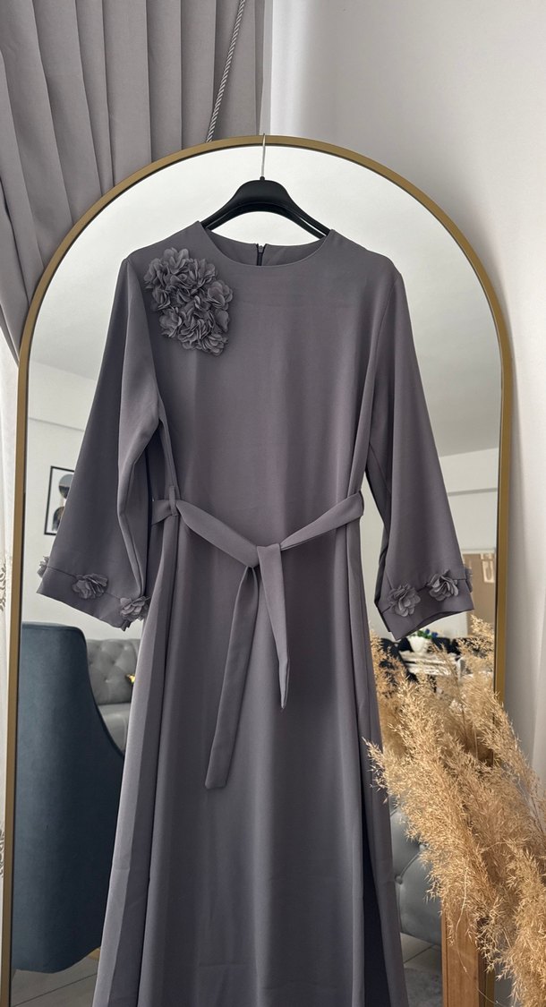 Gri uzun elbise, kemerli ve salaş kesimdir. Uzun kollu ve yuvarlak yaka olup, göğüs ve kol uçlarında nakışlı çiçek detayları bulunur. Ofis için uygundur.