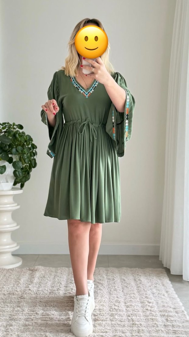 Haki renkli elbise, V yakalı ve drapeli askılı kollu, bol kesimdir. Yumuşak kumaştan, pastel nakış detaylarıyla günlük kullanıma uygundur. yeni etiketsiz. hiç giyemedim. L beden aldım 66-67 kiloyken. geri göndermedim. bir terzide profesyonel kenarlardan aldırdım. bu seferde sağlık sorunları nedeni ile 3-5 kilo alınca olmadı. iade kabul etmem. tüm ölçüler ve detaylar paylasıldı. esneme yapmayan bir kumaş.
