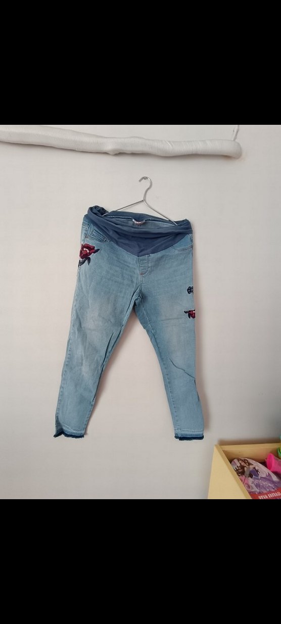 Nakışlı detaylara ve kemerli bele sahip, rahat kesim hamile kot pantolon. Rahat destek için esnek panel içerir.