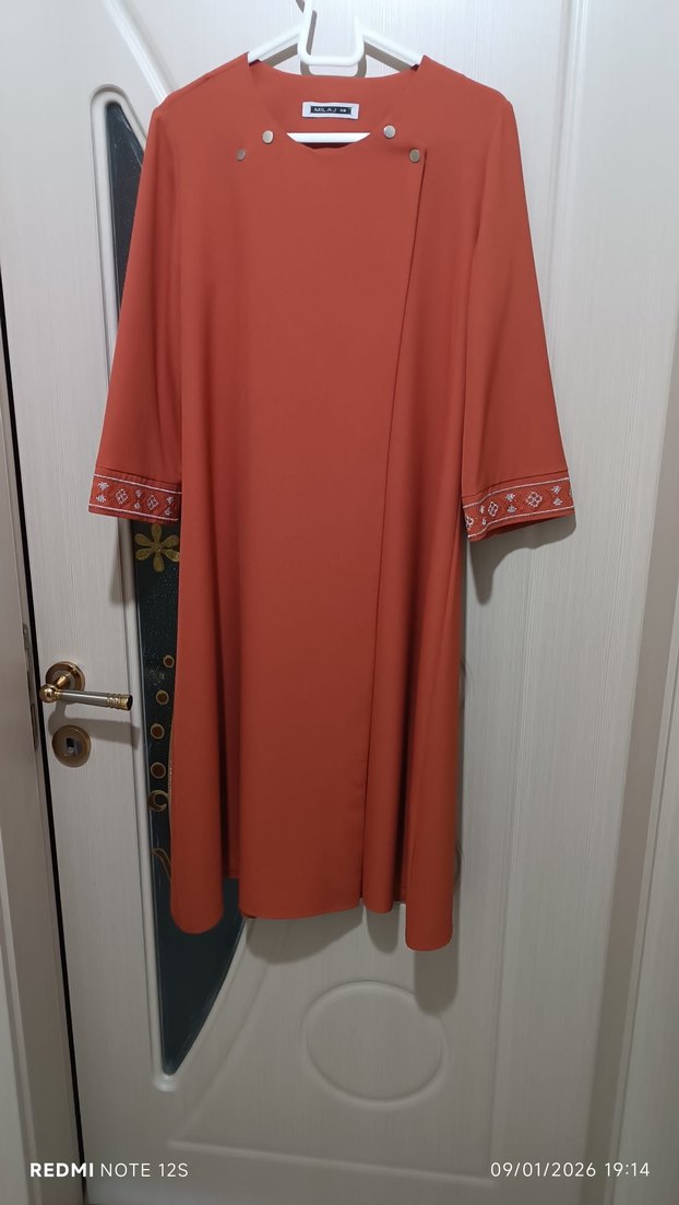 Uzun boy, regular kesim kadın elbise. Minimalist kiremit renkte ve kollarında nakış detaylı. Yaka kısmında düğmeli kapanış bulunur.