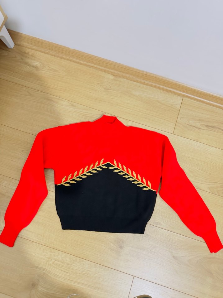 Yüksek yakalı ve uzun kollu, yumuşak dokulu nakışlı kırmızı-siyah renkli, dar kesim kısa kadın kazak. Günlük sokak stili için uygundur.