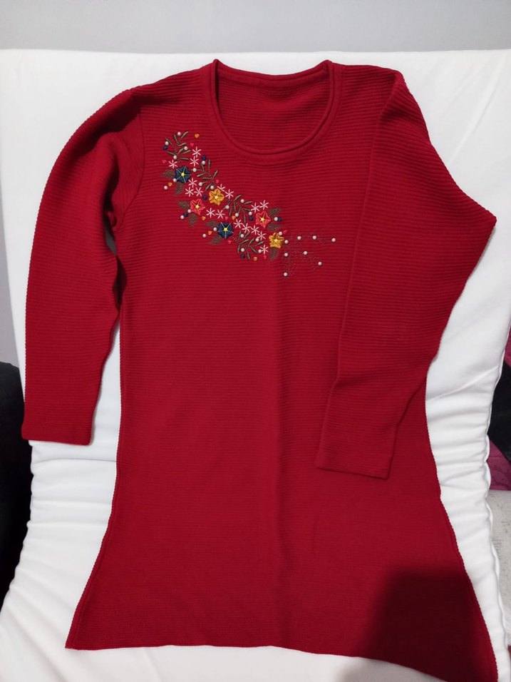Nakış Detaylı Kırmızı Uzun Kollu Triko Kazak Tunik