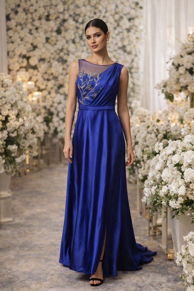 Nakışlı detaylara ve drapeli tasarıma sahip lacivert uzun abiye elbise, klasik ve çağdaş bir görünüm sunar. Düğünler için uygundur. ✨44 42 46