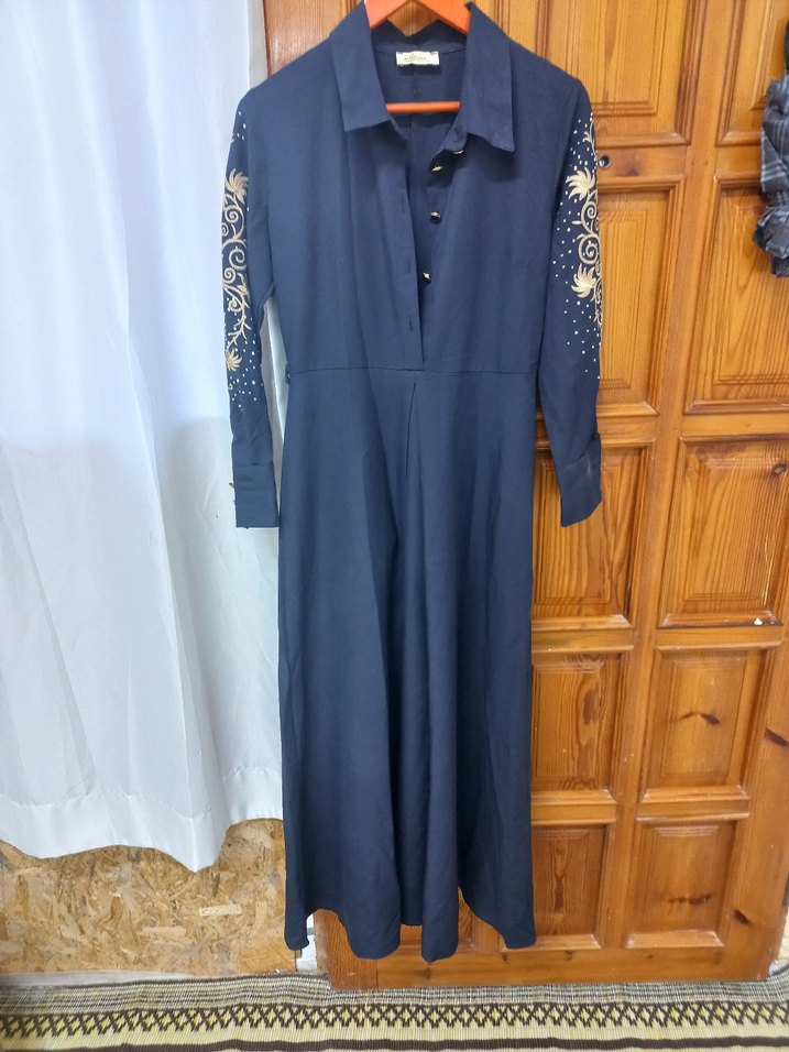 Lacivert renkte, uzun kollu, nakış detaylı ve düğmeli, notched lapel yakalı, ofis için uygun uzun elbise.