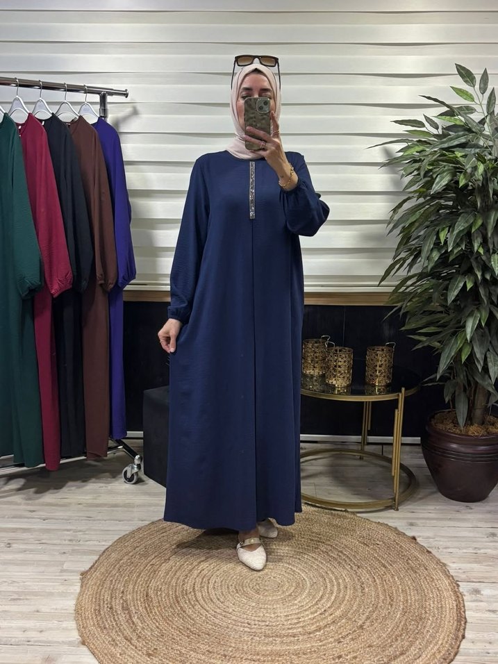 Lacivert uzun elbise, yuvarlak yakalı ve uzun kollu, işlemeli detaylara sahip. Salaş ve tesettürlü kesimiyle ipeksi kumaştan günlük kullanıma uygun.