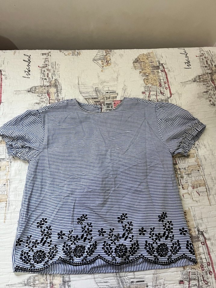 Kısa kollu, salaş kesim gömlek tekne yaka ve düğme detaylı. Etek kısmında siyah nakış işlemeleri bulunur. Günlük kullanıma uygundur.
