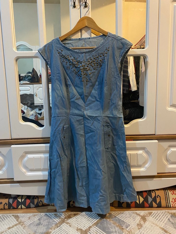 Mavi denimden yapılmış, V yaka ve kolsuz bohem elbise. Nakışlı ve dökümlü detaylarıyla rahat bir kesime sahiptir.