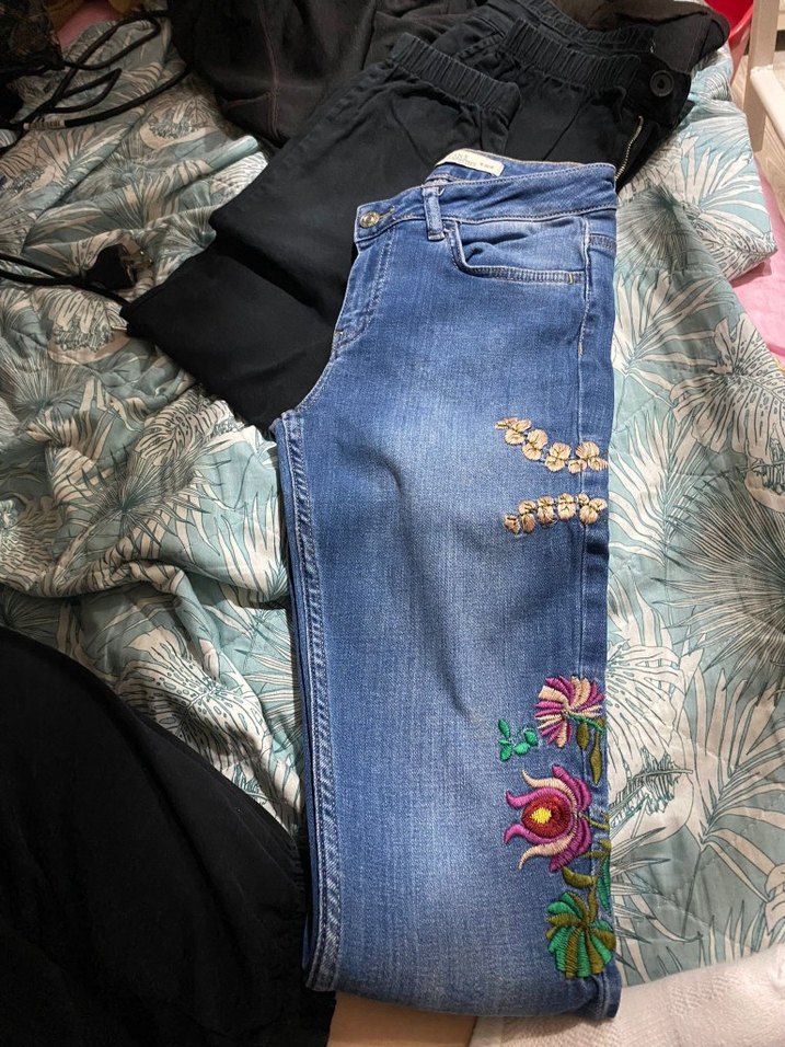 Nakışlı çiçek desenleri ve düğmeli kapanışa sahip, bohem tarzda mavi fitted denim kadın pantolon.