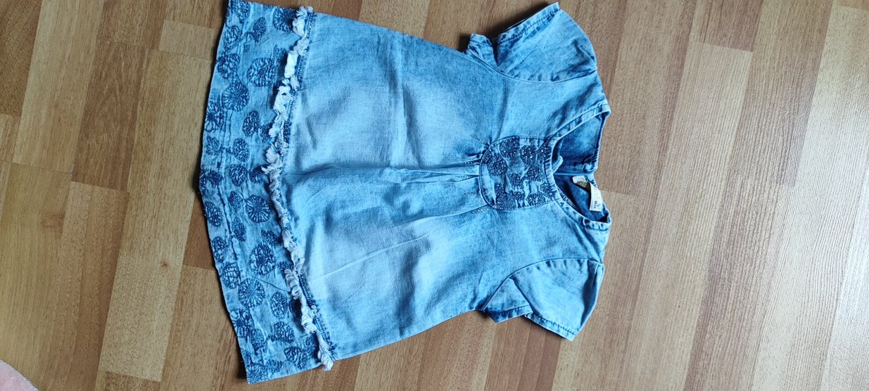 Mavi denimden üretilmiş, nakışlı, düğmeli ve V yakalı bol kesim kısa kollu kız elbisesi. Bohem tarzda rahat bir görünüm sunar. koltaltindan kolaltina 27 cm arka yaka kısmı dan etek ucu 40 cm