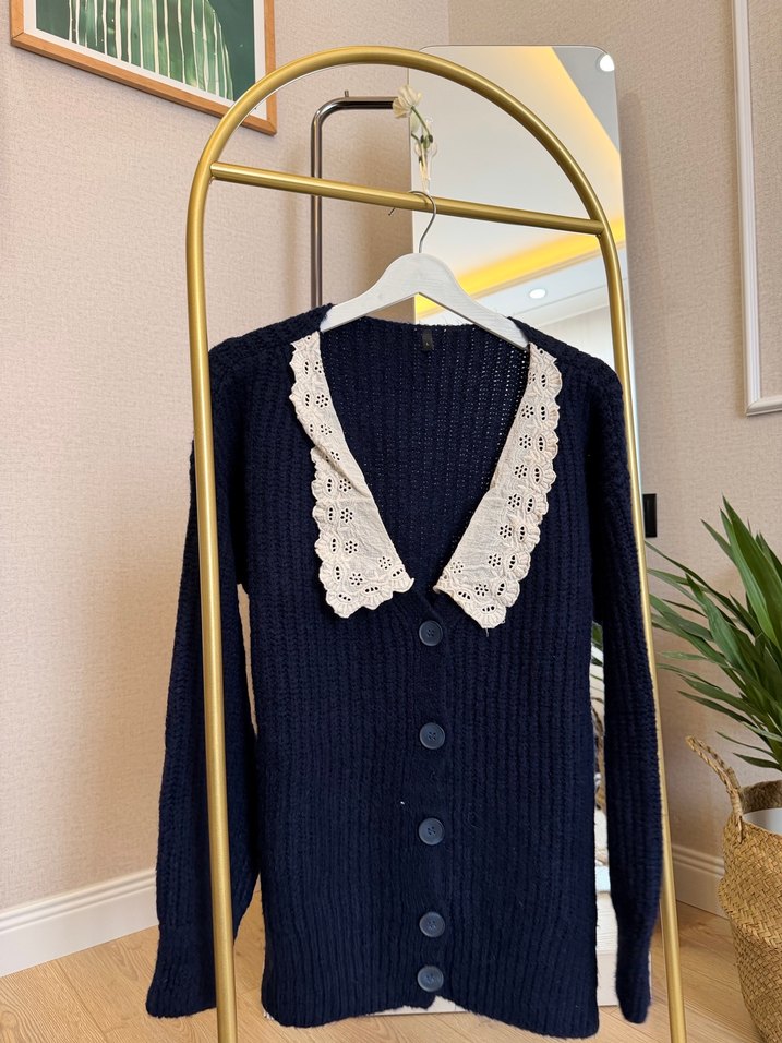 Nakış işlemeli yakası ve uzun kollu, koyu mavi örme kadın hırkasıdır. Günlük kullanıma uygun, modern klasik tarzda, normal boyda ve regular kesimdedir.