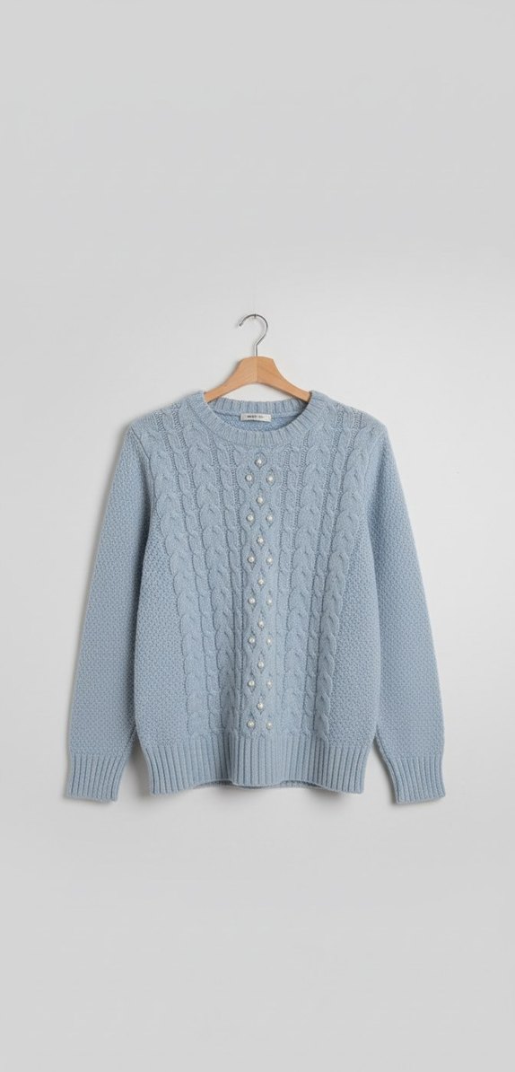 Pastel mavi renkte, nakış desenli, yuvarlak yakalı ve uzun kollu triko kazak. Rahat ve bol kesimiyle günlük kullanıma uygundur.