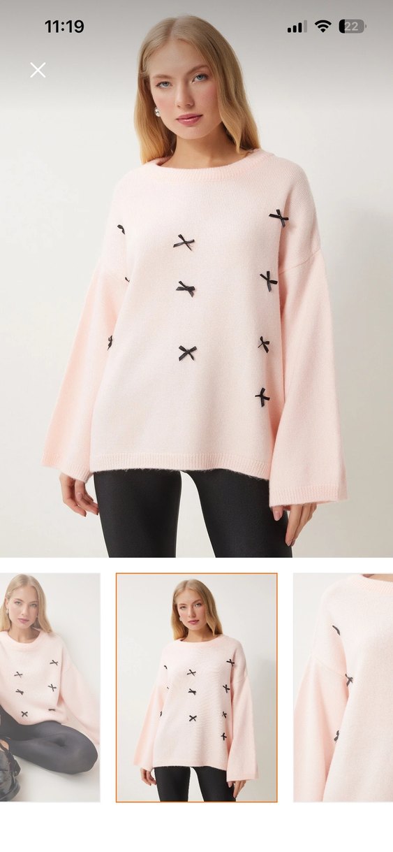 Pembe renkte, uzun kollu, yuvarlak yakalı, bol kesim örgü kazak. Üzerinde küçük nakış fiyonk detayları bulunur, rahat ve trend bir günlük stil sunar.