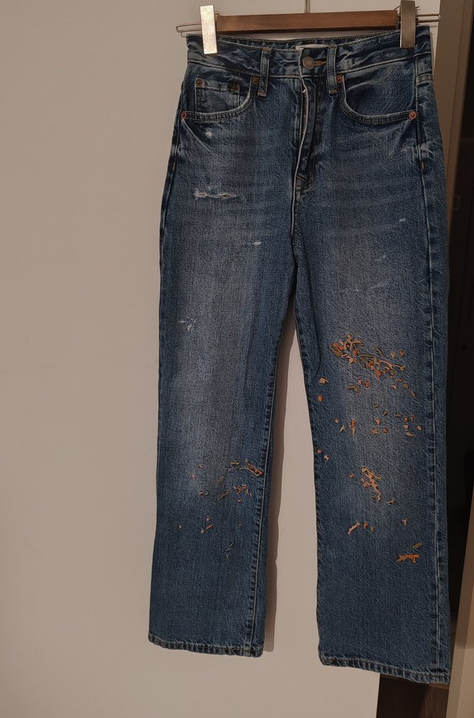 Bu koyu renkli kot pantolon, bol kesim ve nakış detaylarıyla dikkat çekiyor. Tokalı bel detayıyla şıklık katıyor, günlük kullanıma uygun rahat bir model. 25 beden