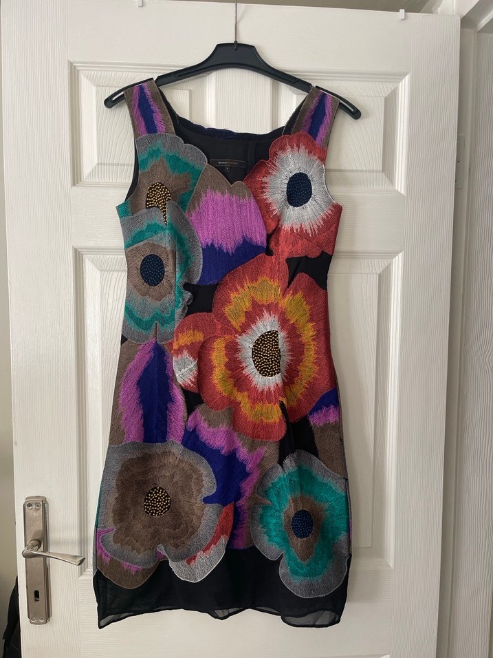 Nakış işlemeli, canlı tie-dye çiçek desenli, askısız ve kolsuz bohem midi elbisedir. Parti için uygundur.