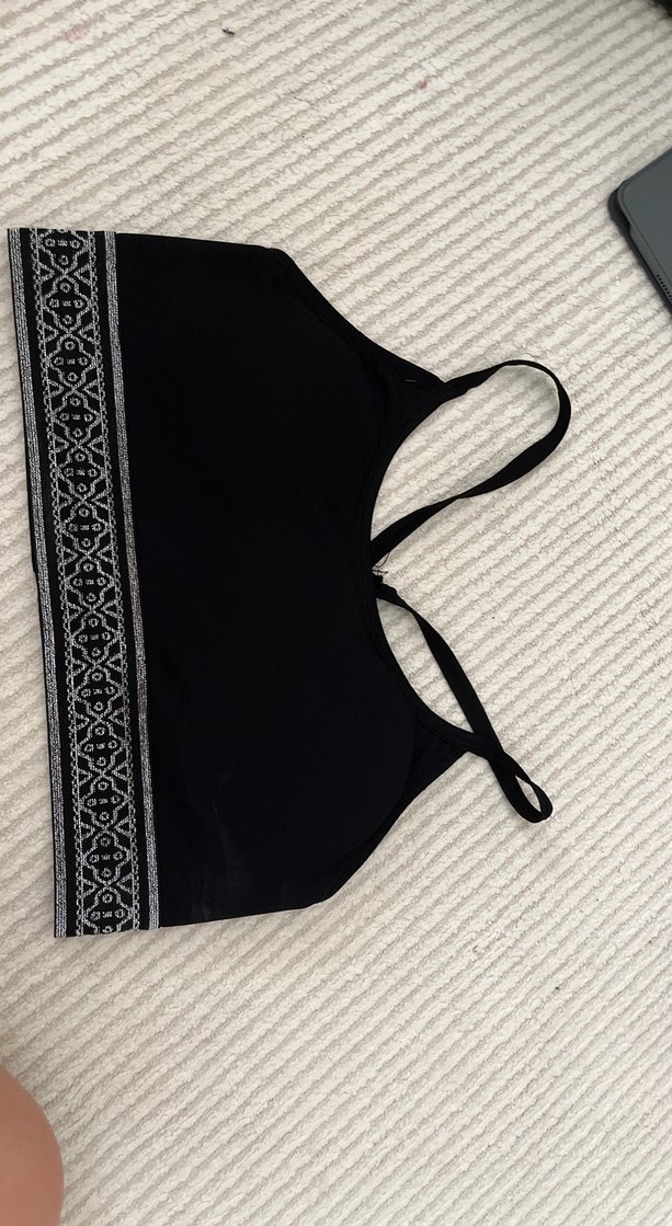 Nakış detaylı, siyah bohem stilde normal boyda sütyen. İnce askılı ve rahat kesim, athleisure tarzına uygun.