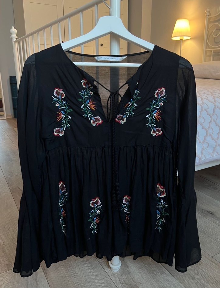 Siyah tekstil bluz, uzun kollu, V yaka ve bol kesimdir. Nakışlı çiçek desenleri detayları bulunur, romantik akşamlar için uygundur.
