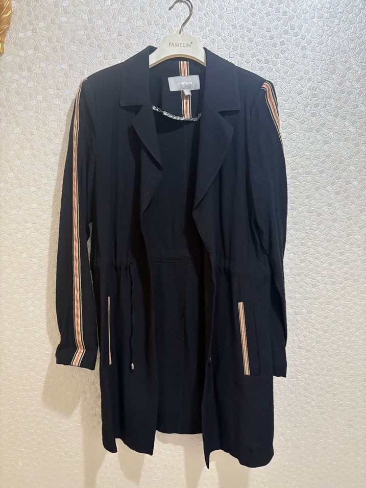 Siyah hamile trençkot, yakalı ve kemerli tasarıma sahip. Uzun boy, askılı kollar ve nakış detaylarıyla günlük rahat kullanıma uygun. Sentetik kumaştan, Paris sokak modası tarzında.