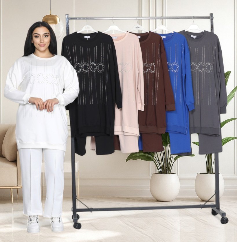 Pamuk kumaştan, nakış detaylı, uzun kollu, bol kesim siyah kadın takımı. Rahat ve şık, günlük kullanıma uygun.