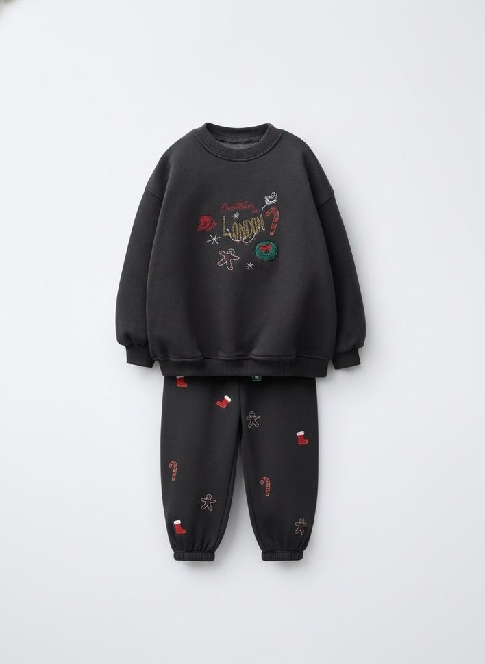 Nakış Detaylı Siyah KIZ ERKEK Sweatshirt ve Eşofman Takımı