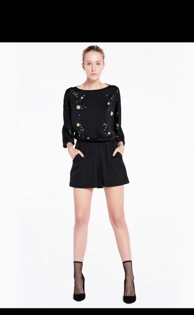 Uzun kollu ve yuvarlak yakalı siyah mini tulum önünde nakış detayları bulunur. Rahat kesimi ve yumuşak kumaşıyla romantik akşamlar için uygundur.