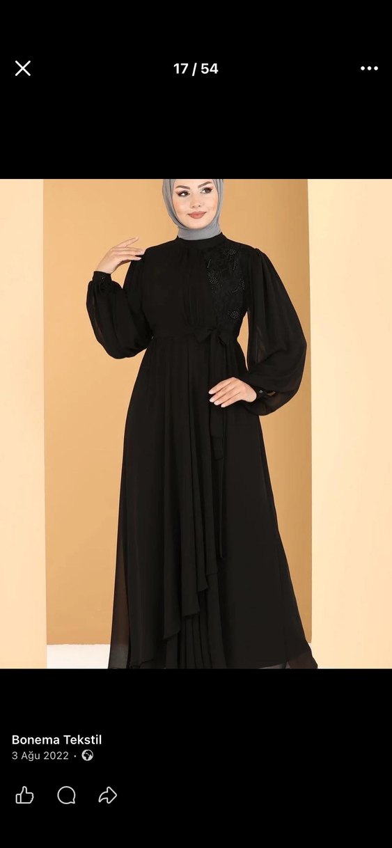 Bu siyah uzun elbise yüksek yakalı, uzun kollu ve bol kesimdir. Nakış detayları ve drapeli tasarımı vardır, sentetik kumaştan üretilmiştir.