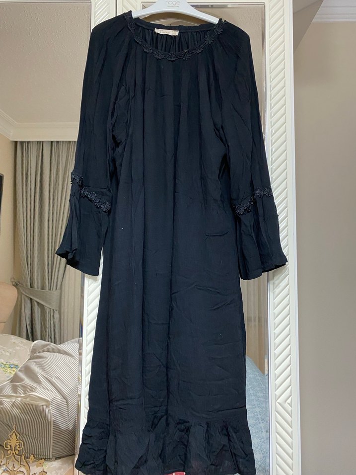 Siyah renkte, keten kumaştan, bol kesim ve drapeli uzun kollu, nakış detaylı bohem tarzda uzun tunik. Yüksek yakalı, günlük kullanım için uygundur. 109 boy 88 iç astar uzunluk 42 beden Koltukaltı en 70 cm