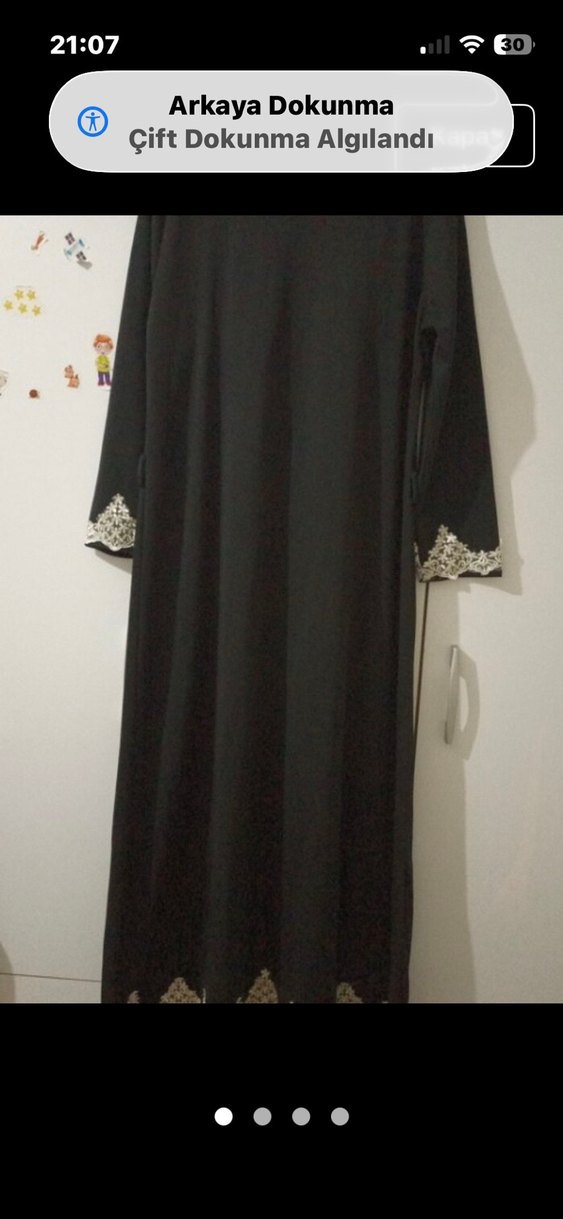 Siyah, uzun kollu, dökümlü sentetik kumaştan yapılmış, V yaka ve nakış detaylı, bol kesim günlük kullanıma uygun tesettür elbise.