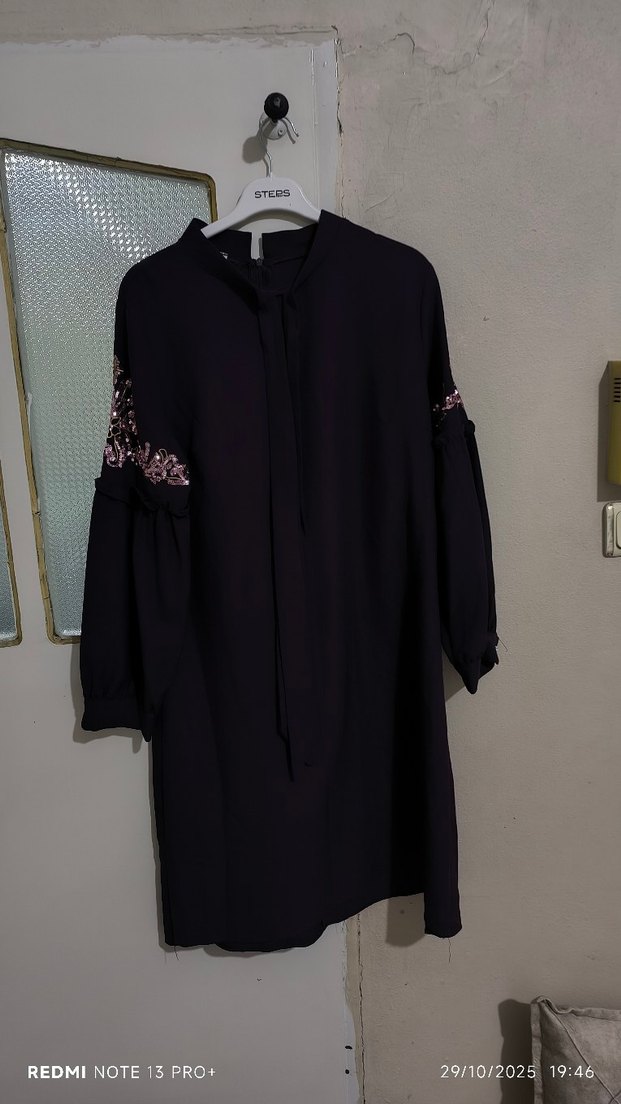 Yüksek yakalı, bol kesim siyah uzun kollu tunik. Kollarında nakış detayları ve dökümlü yapısıyla gotik tarzda tasarlanmıştır. bol olduğu için giymiyorum
