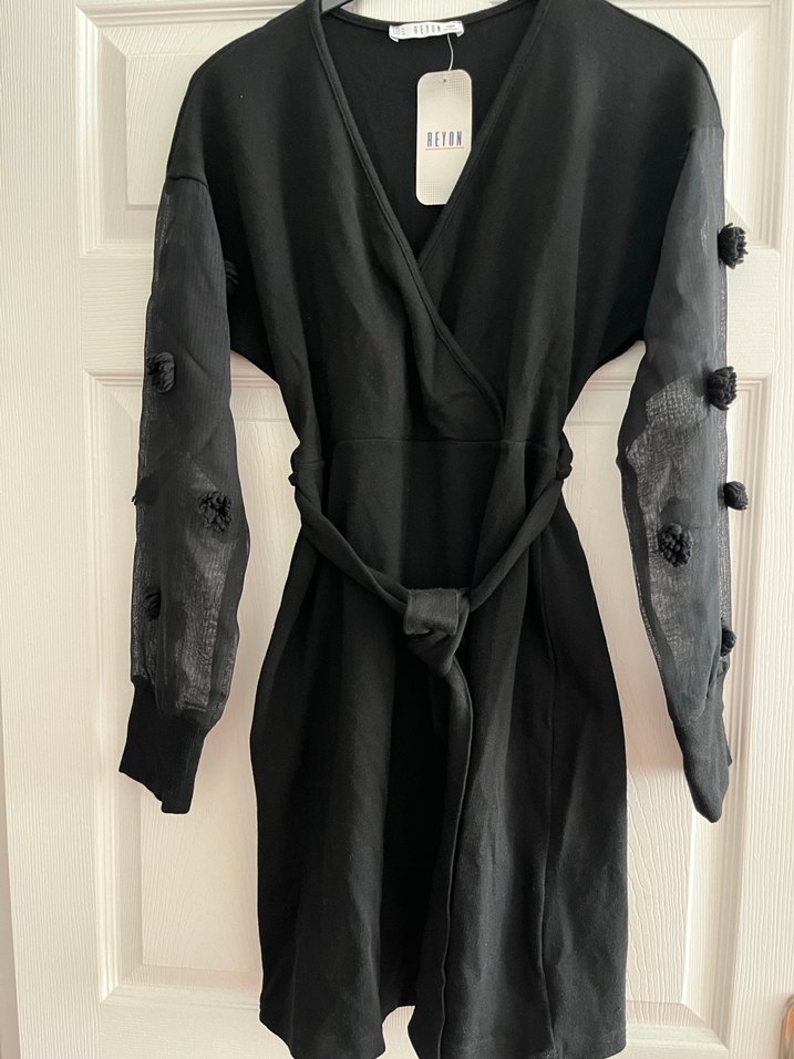 Bu siyah kadın sabahlık, kollarında nakışlı çiçek detayları bulunan uzun kolludur. Bol kesim ve uzun boy olup, belden bağlanarak şekillendirilir. Parisian goth tarzını yansıtır.