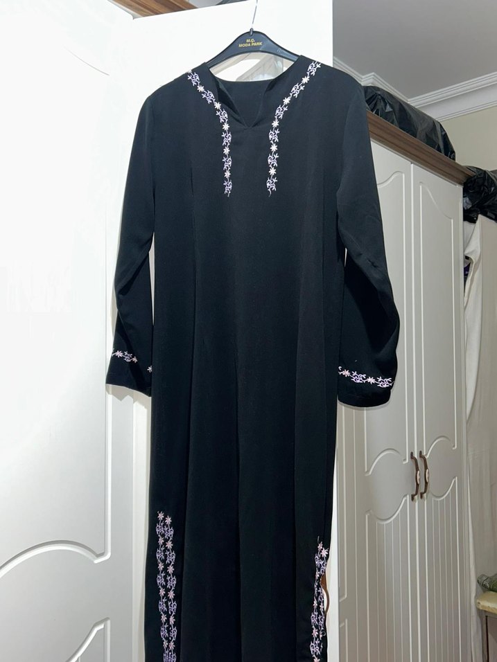 Siyah uzun elbise, V yakalı ve uzun kolludur. Yakada, manşetlerde ve etek yanlarında nakış detayları bulunur. Rahat kesim ve dökümlü yapıya sahiptir, sentetik kumaştandır. Defosu yoktur. Pazarlık yaparım