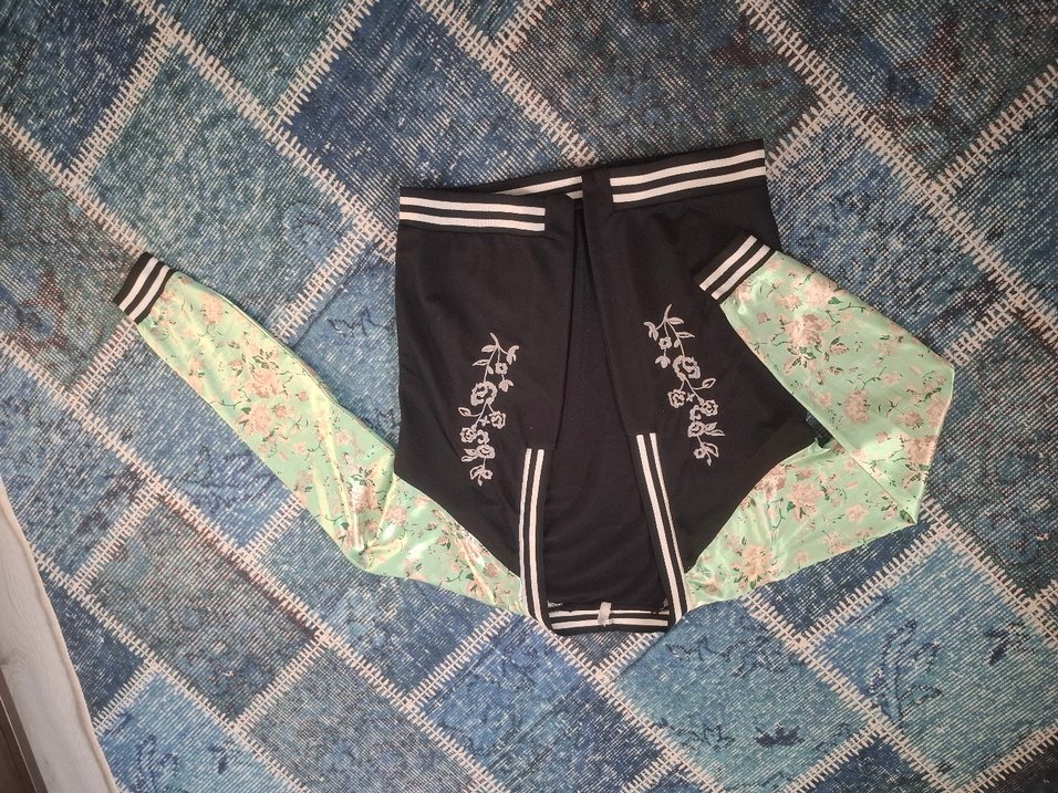 Siyah, nakışlı çiçek desenleri detayları içerir. Günlük rahat sokak stili için uygundur.