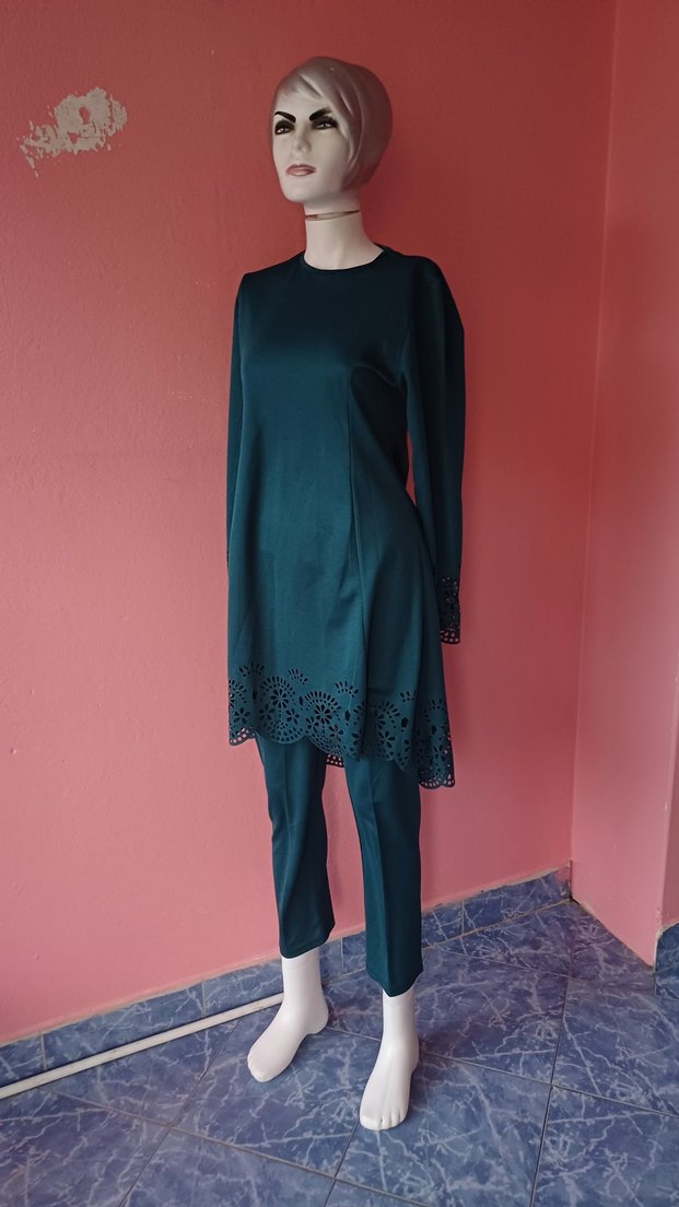 Sentetik kumaştan, yuvarlak yaka ve uzun kollu, nakış detaylı uzun turkuaz üst ve uyumlu pantolondan oluşan kadın takımı. Minimalist ve sade stil için uygun.