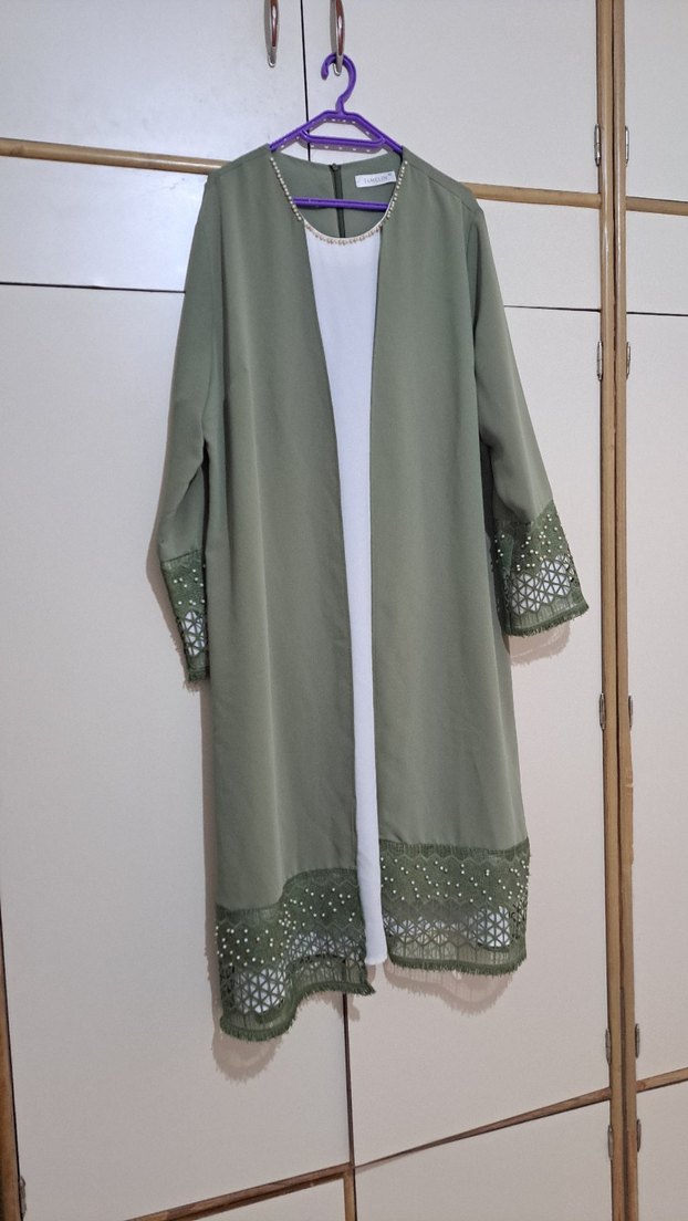 Uzun, haki renkli kadın ceket; manşet ve etek kısmında nakış detaylarıyla minimalist bohem tarz sunar, uzun kolludur.. ozel günlerinizde şık bir tunik olarak kullanılır bir kaç kez giyilmis 52 bedendir. kalitelidir