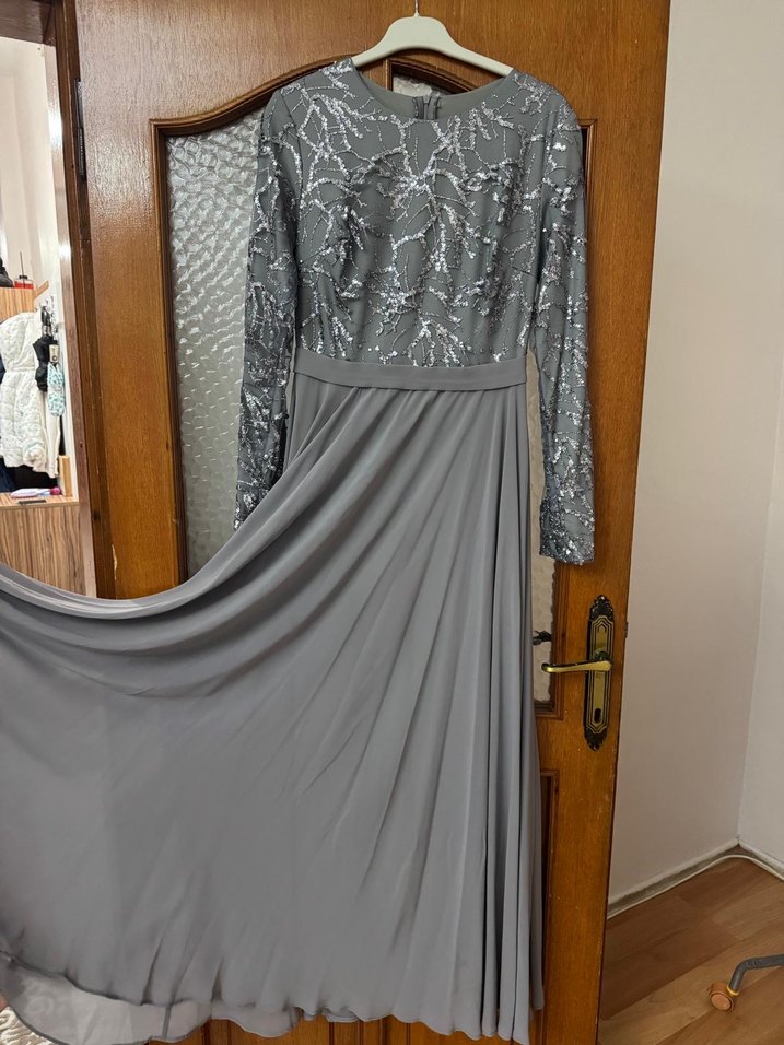 Nakış işlemeli uzun kollu üst kısmı ve drapeli bol etekli uzun gri abiye elbise, modern klasik tarzda şıklık sunar.