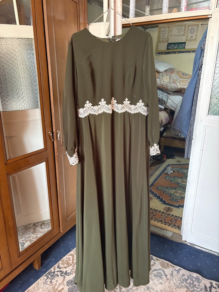 Haki renkli, uzun kollu, dökümlü kesime sahip bu elbise, yakasında kesik yakalı ve bel ile kollarında nakış detayları bulunur. İpek gibi dokusuyla mütevazı ve vintage tarzlara uygundur, düğün için idealdir.